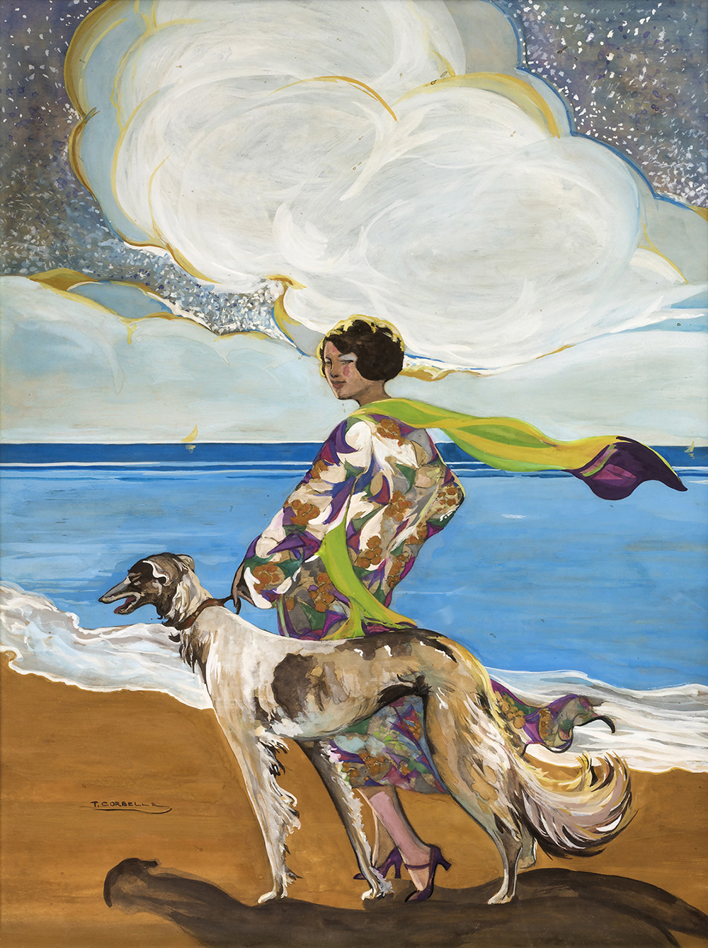 TITO CORBELLA Donna con levriero, Anni ‘30 Tempera su cartoncino, 51 x 37 cm Firma in basso a sinistra: T. Corbella