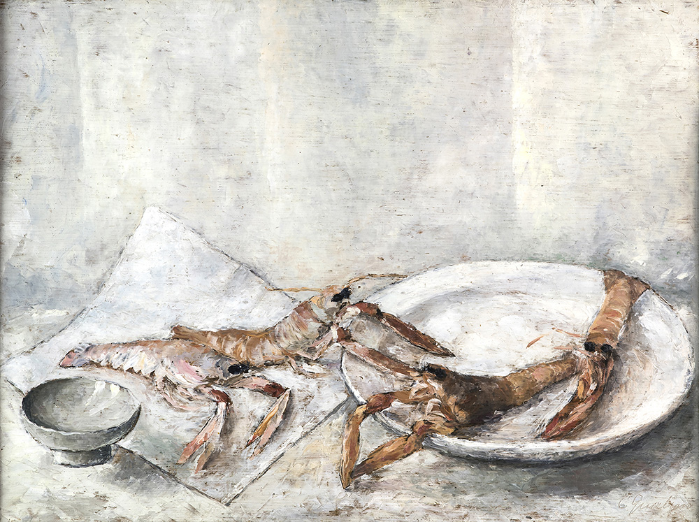 CESARINA GUALINO Scampi, 1935 Olio su tavoletta, 36,5 x 45,5 cm Firma in basso a destra: C.Gualino Al retro etichetta: Roma - Aprile 1935 / Mostra “Palma” 1947 / C. Gualino