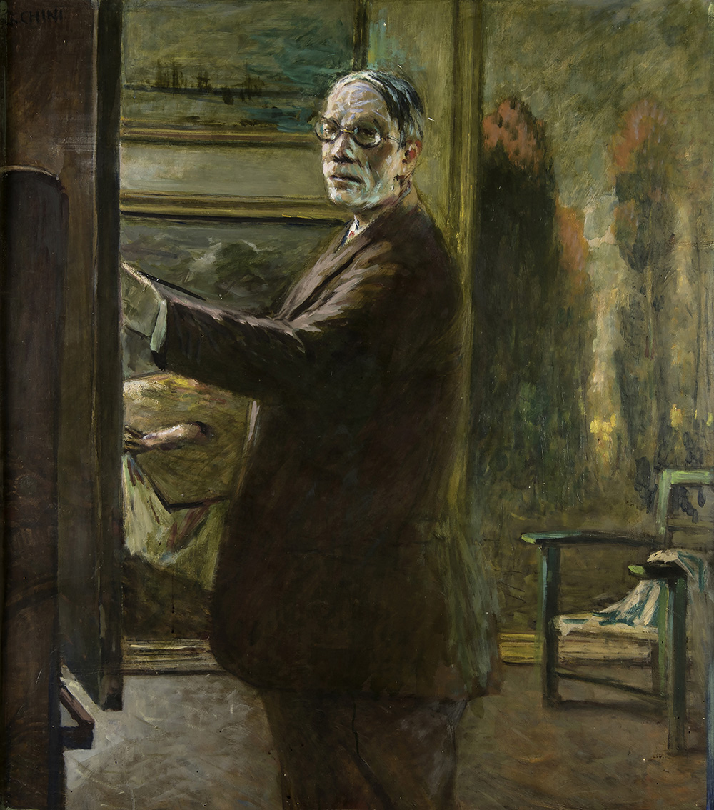 GALILEO CHINI Allo Specchio - Autoritratto, 1946 circa Olio su tavola, 99 x 87 cm Firma in alto a sinistra: G.Chini Firma e titolo al retro: G.CHINI / ALLO. SPECCHIO- Acquerello per lo studio di un mosaico al retro ESPOSIZIONE Eredità dell’impressionismo 1900 - 1945, Palazzo dellel Esposizioni, Roma 1995, ripr. pag. 105; Il volto e l’anima, Arco Farnese, Roma 1996