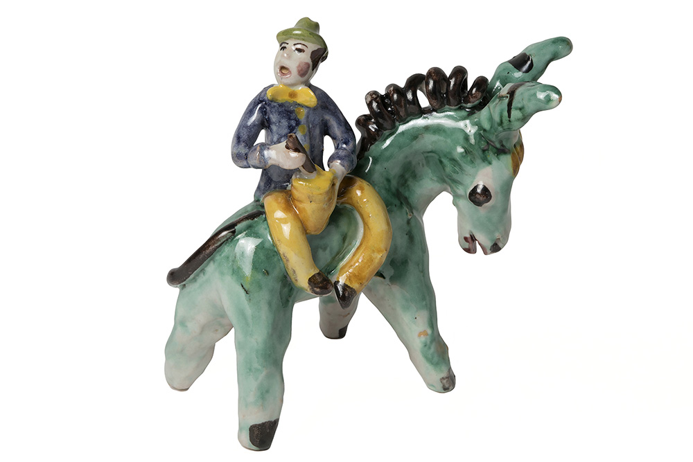 VIETRI (attribuibile Anzengruber) Uomo con asinello, Anni ‘30 Scultura in ceramica dipinta, 18 x 15 cm Inscritto sotto la base: ITALY - 13 Esemplari simili sono pubblicati in “Le ceramiche Italiane di Leopold Anzengruber da Vietri a Firenze 1932-1941”, a cura di Giorgio Levi, 2016, p. 132 fig. 11.5 e p. 55 fig. 5.31