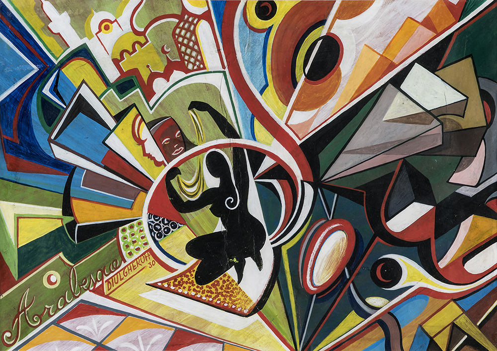 NICOLAJ DIULGHEROFF Arabesque, 1930 Tempera su cartoncino applicato su tela, 39 x 52 cm Firma, data e titolo in basso a sinistra: Arabesque / Diulgheroff 30 PROVENIENZA Collezione Ramazzotti, Roma Autentica su foto di Anna D’Ascanio, Roma, 6 ottobre 2005
