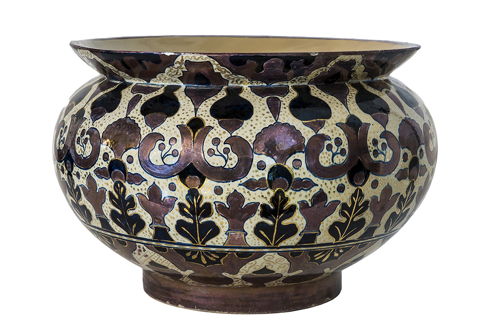 MORETTI - ROMA Grande vaso decorato a motivi vegetali stilizzati e volute Ceramica dipinta e dorata, 24 x 32,5 cm Marchio sotto la base: Moretti - Roma CONDITION REPORT Piccole sbeccature lungo i bordi