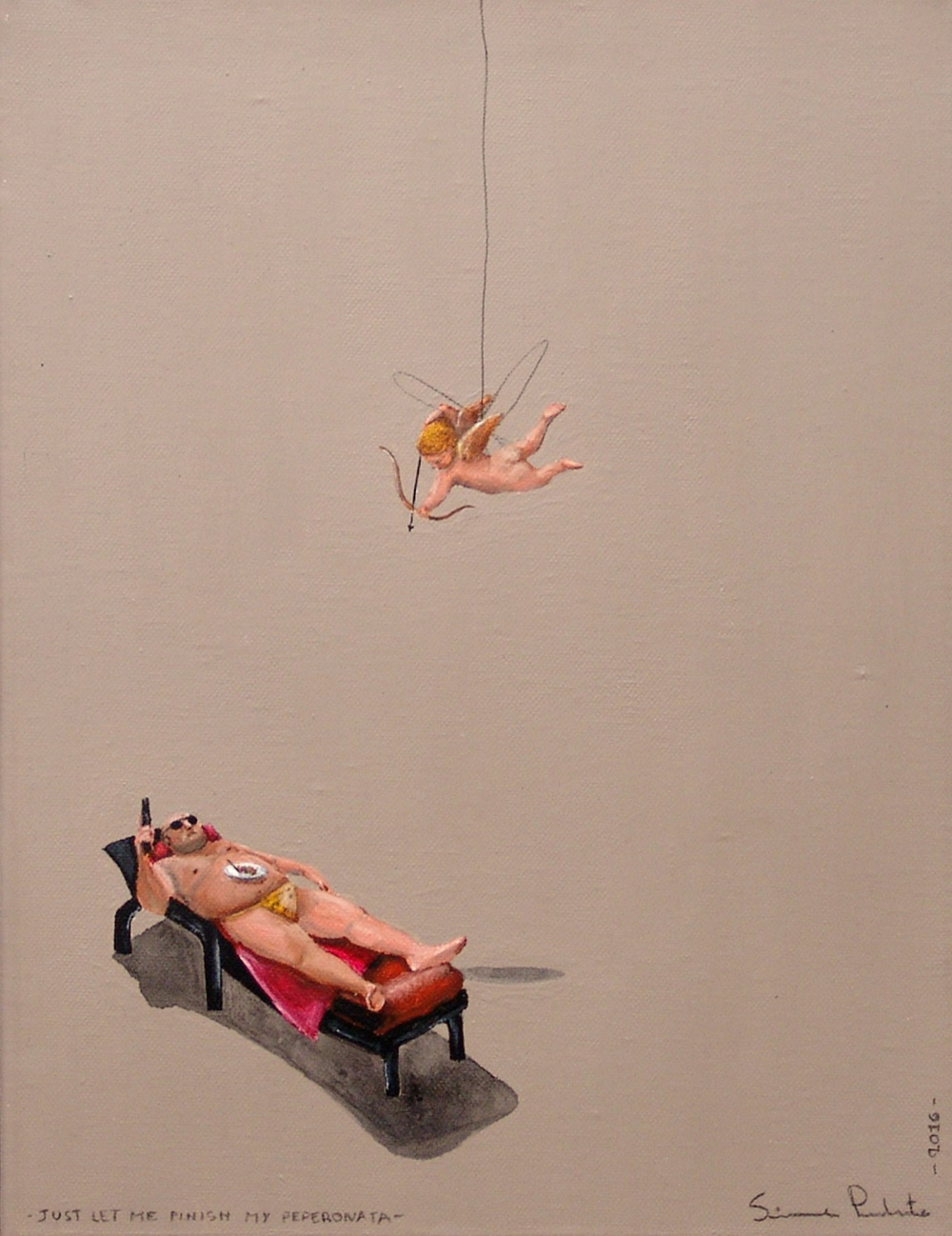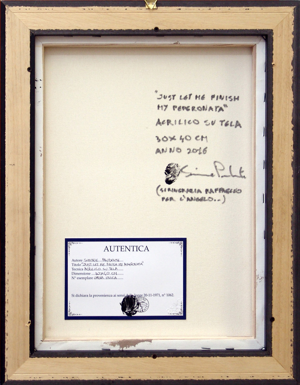 Simone Prudente 1978, Pordenone (Pn) - [Italia] Just let me finish my peperonata acrilico su tela 40x30 cm 2016 firma dell’artista in basso a destra e sul retro; opera con cornice certificato di autenticità firmato dall'artista