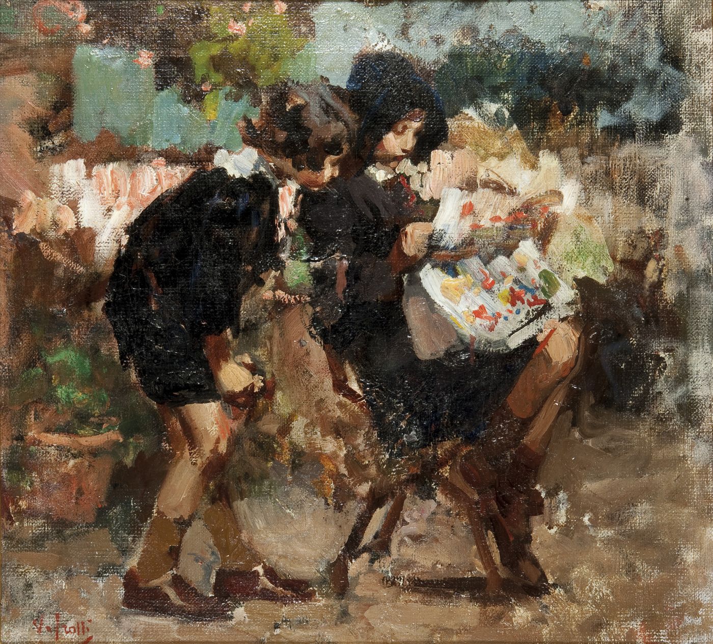 IROLLI VINCENZO Napoli 1860 - 1949 "La lettura" 44x49 olio su tela Opera firmata in basso a sinistra