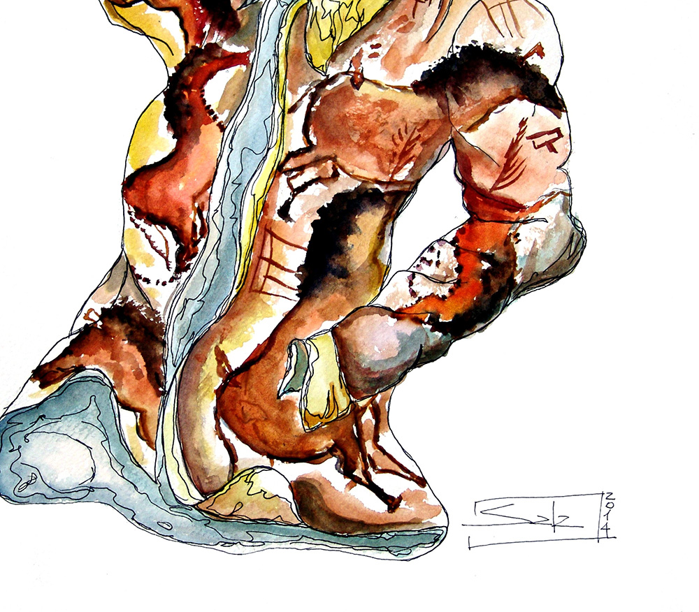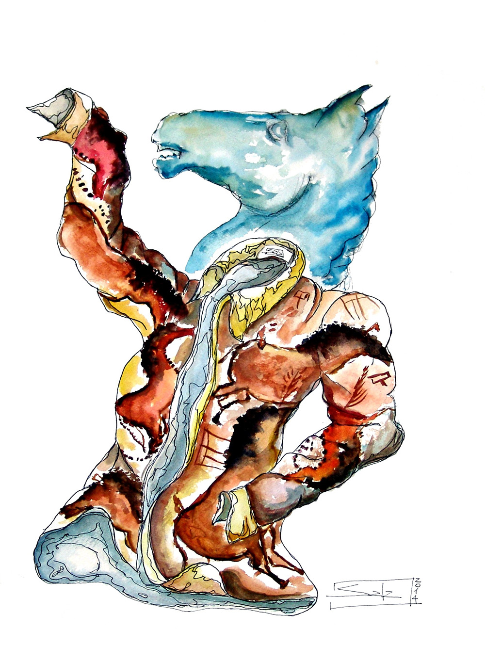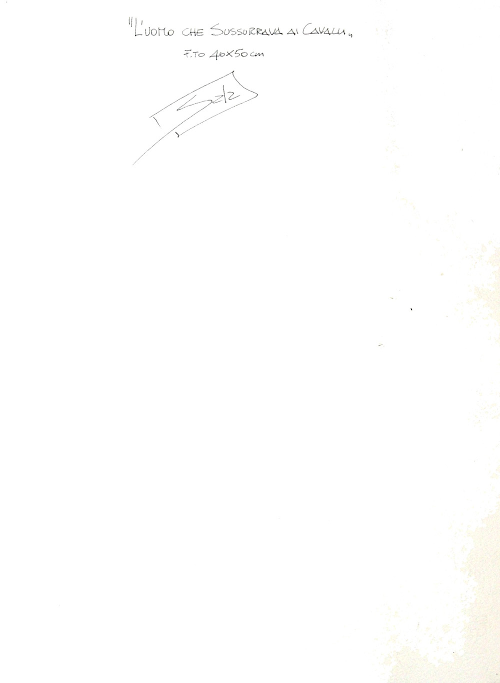 Alessandro Sala 1958, Genova (Ge) - [Italia] L'uomo che sussurrava ai cavalli acquerello su carta 50x35 cm 2014 firma dell’artista in basso a destra e sul retro certificato di provenienza garantita Picenum
