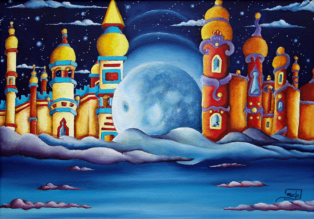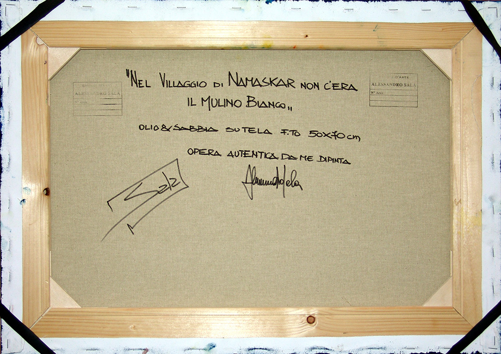 Alessandro Sala 1958, Genova (Ge) - [Italia] Nel villaggio di Namaskar non c'era il mulino bianco olio e sabbia su tela 50x70 cm firma dell’artista in basso a destra e sul retro certificato di provenienza garantita Picenum