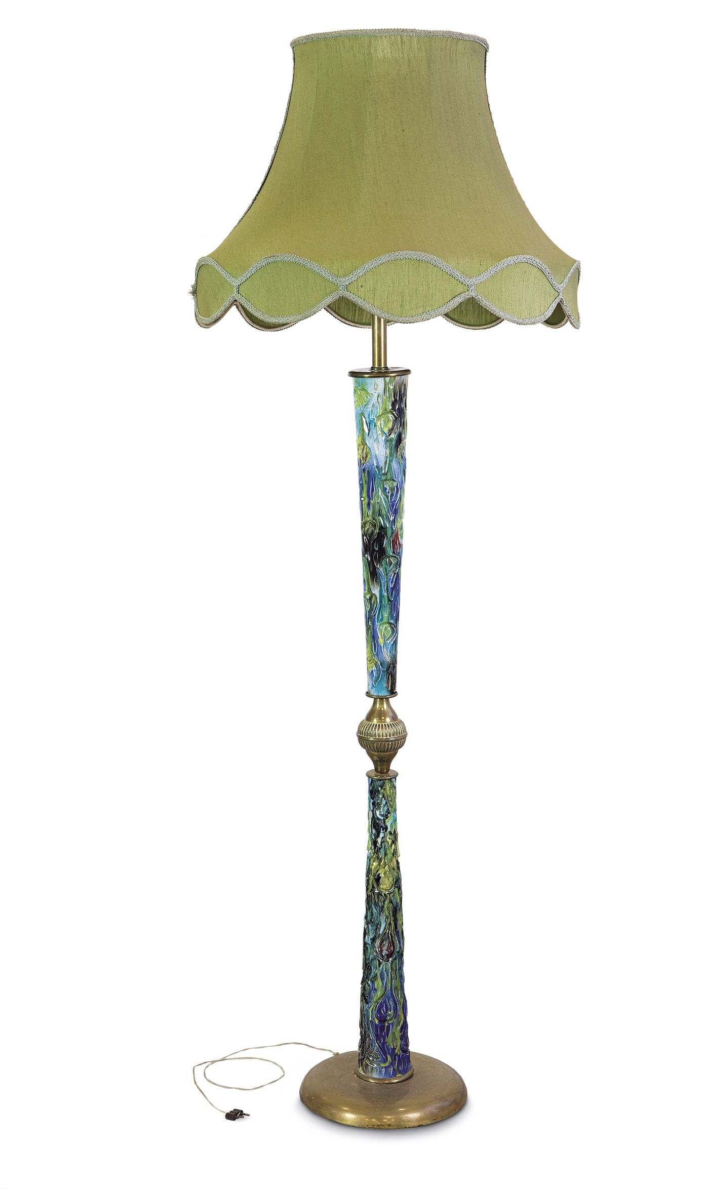 PIANTANA - Lampada da terra in ceramica. Supporto costituito da due coni in ceramica decorata e struttura in ottone. Paralume in stoffa. H cm. 178
