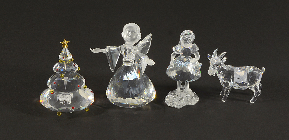 SWAROVSKI, lotto di quattro sculturine in cristallo raffiguranti un albero di Natale, una contadinella, un angioletto e una capretta (h massima cm 9,5), in custodie originali
