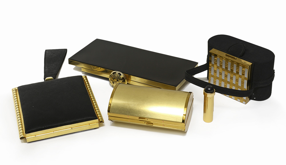 DORITTE, INDUSTRIE ARGENTINE E ANONIMI Lotto composto da due clutch e due borsette con manico, di cui una clutch vanity case e una borsetta con portacipria uniti a un porta rossetto, tutti in metallo color oro e rifiniture in tessuto e altri materiali color nero DORITTE, INDUSTRIE ARGENTINE E ANONIMI Lotto composto da due clutch e due borsette con manico, di cui una clutch vanity case e una borsetta con portacipria uniti a un porta rossetto, tutti in metallo color oro e rifiniture in tessuto e altri materiali color nero Lot comprising two clutches and two carryalls