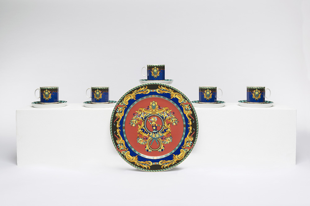 Versace: lotto composto da cinque tazzine con cinque piattini (diam. cm 13,5) e un piatto da parete (diam. cm 31) in porcellana Rosenthal policroma con decoro serie Le Roi Soleil Versace: lot comprising five Rosenthal porcelain cups with small dishes (diameter 13,5cm) and a decorative plate (diameter 31cm) with Le Roi Soleil series pattern