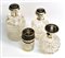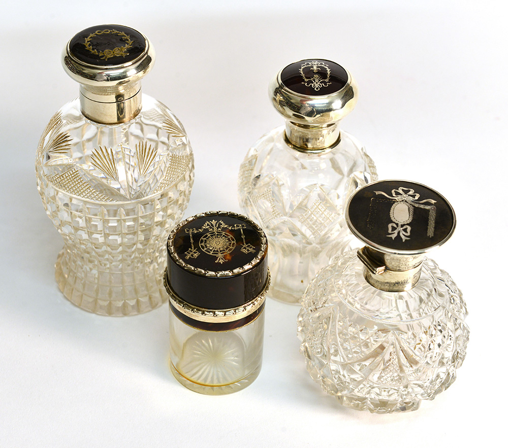 Lotto di quattro bottiglie in vetro ialino molato e inciso misure a forme diverse con tappo in argento e tartaruga, secolo XIX