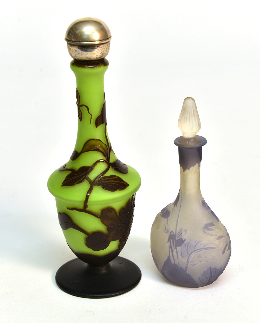 Emile GallÈ. Lotto composto da due bottiglie in vetro cammeo di diverso decoro e fattura.