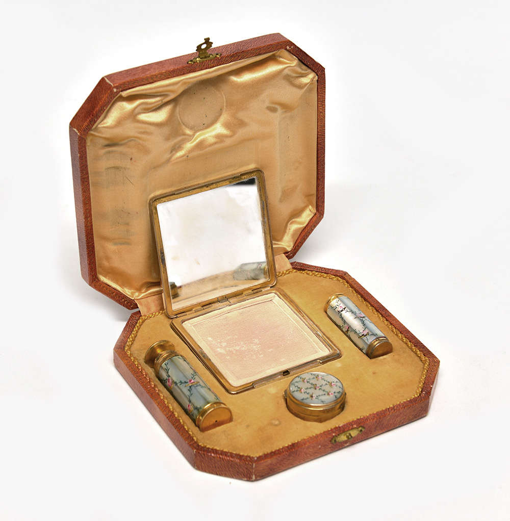 MIREILLE Vanity set in metallo rifinito con madreperla incisa con disegno floreale smaltato in confezione originale (lievi difetti) MIREILLE Vanity set in metallo rifinito con madreperla incisa con disegno floreale smaltato in confezione originale (lievi difetti) Vanity set in original presentation box (minor defects)