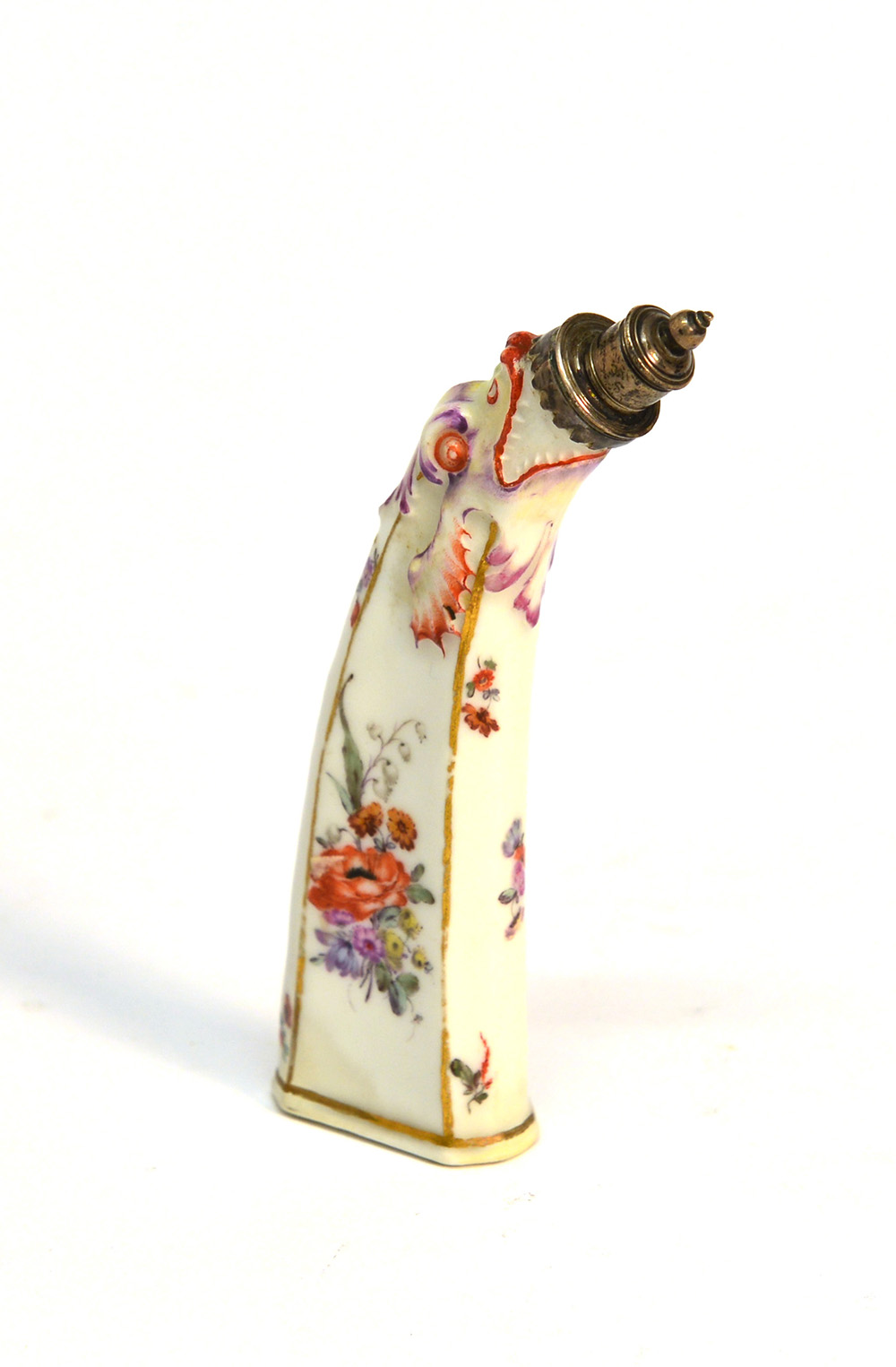 Boccetta porta profumo in porcellana decorata in policromia a fiori a forma di tritone, ghiera e tappo in argento. Francia, secolo XIX