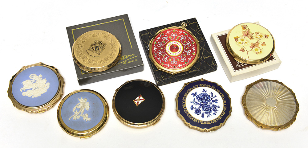 STRATTON ñ Lotto di otto portacipria rotondi in metallo color oro con varie lavorazioni, uno con stemma Manchester City, uno a ricordare un orologio da tasca, rifiniti con incisioni, smalti e cammei di Wedgewood. Tre in confezione originale. (difetti) STRATTON ñ Lotto di otto portacipria rotondi in metallo color oro con varie lavorazioni, uno con stemma Manchester City, uno a ricordare un orologio da tasca, rifiniti con incisioni, smalti e cammei di Wedgewood. Tre in confezione originale. (difetti) Lot comprising eight compacts of which three in original boxes (defects)