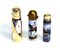 Lotto di tre boccette porta profumo in in ceramica e smalti, una decorata con fantino e tappo a forma di cap.