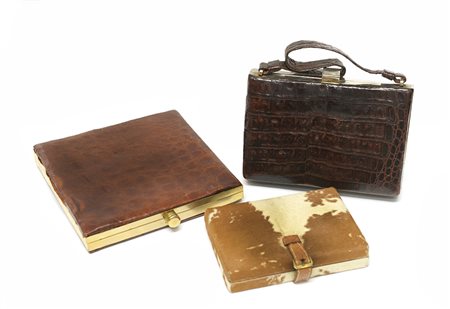 Lotto di tre trousses porta oggetti, di cui due in coccodrillo sui toni del marrone, una a forma di borsetta e uno in cavallino a ricordare un'agenda. La pi˘ grande cm 18x18x2.5 Lotto di tre trousses porta oggetti, di cui due in coccodrillo sui toni del marrone, una a forma di borsetta e uno in cavallino a ricordare un'agenda. La pi˘ grande cm 18x18x2.5 Lot comprising three leather purses of which one alligator and one in cavallino leather