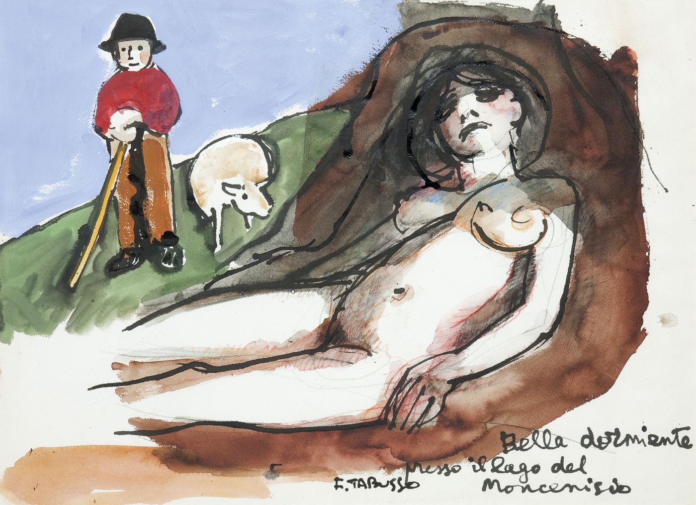 TABUSSO FRANCESCO Sesto San Giovanni (MI) 1930-2012 Torino "Bella dormiente presso il lago del Moncenisio" 55x75 tempera su carta Opera firmata ed intitolata in basso a destra Autentica dell'artista su fotografia
