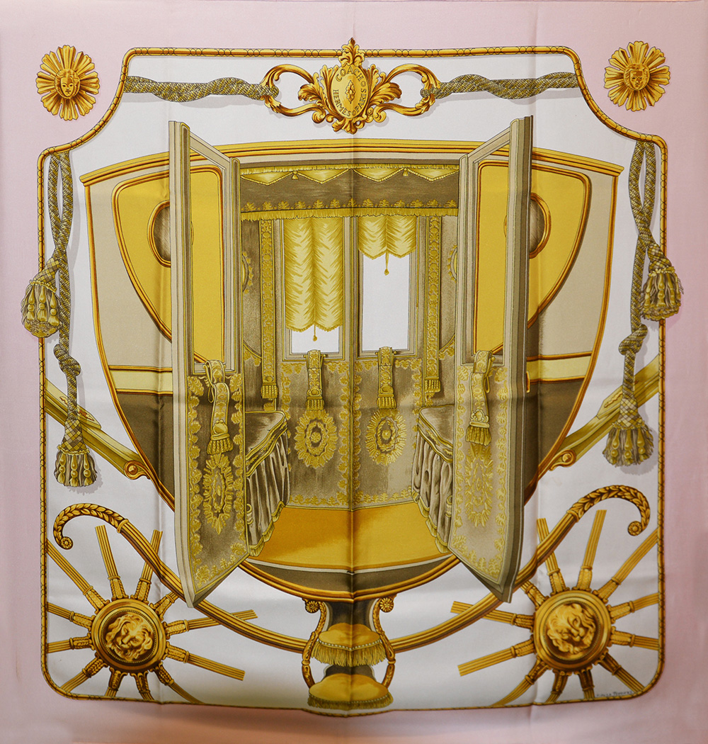 HERMES - Foulard in seta stampa "Coach" su fondo bianco con bordo rosa, FranÁoise De La Perriere, anni 60 (lievi difetti)