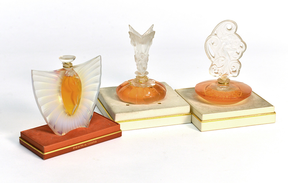 LALIQUE ñ Lotto di tre bottiglie di profumo nuove, in vetro opalino o satinato, tra cui "Les FÈes" e "Millenium Edition" (4G01, 9E13, 5D01) cm 12.5 ñ 15.5