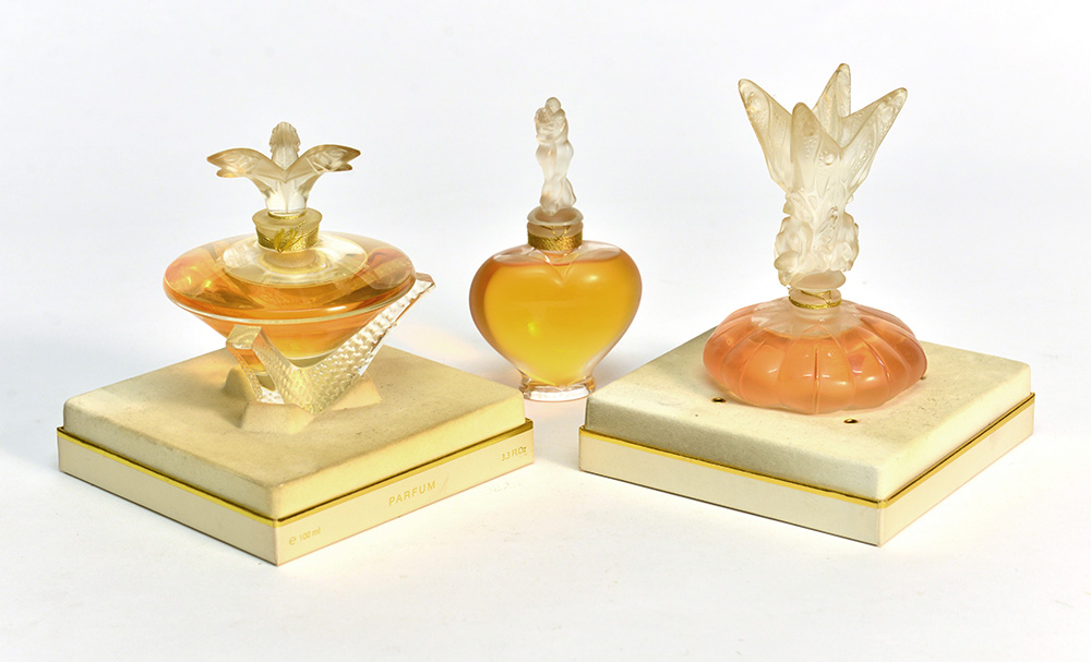 LALIQUE ñ Lotto di tre bottiglie di profumo piene in vetro ialino satinato e non una a forma di cuore con due innamorati, una con due angeli e líaltra con tre pesci