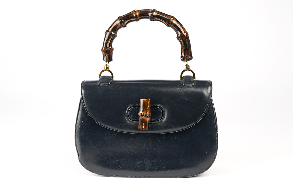 GUCCI Borsa "Bamb˘" in capretto blu, rifinita in metallo color oro (cm 25) (segni d'uso)