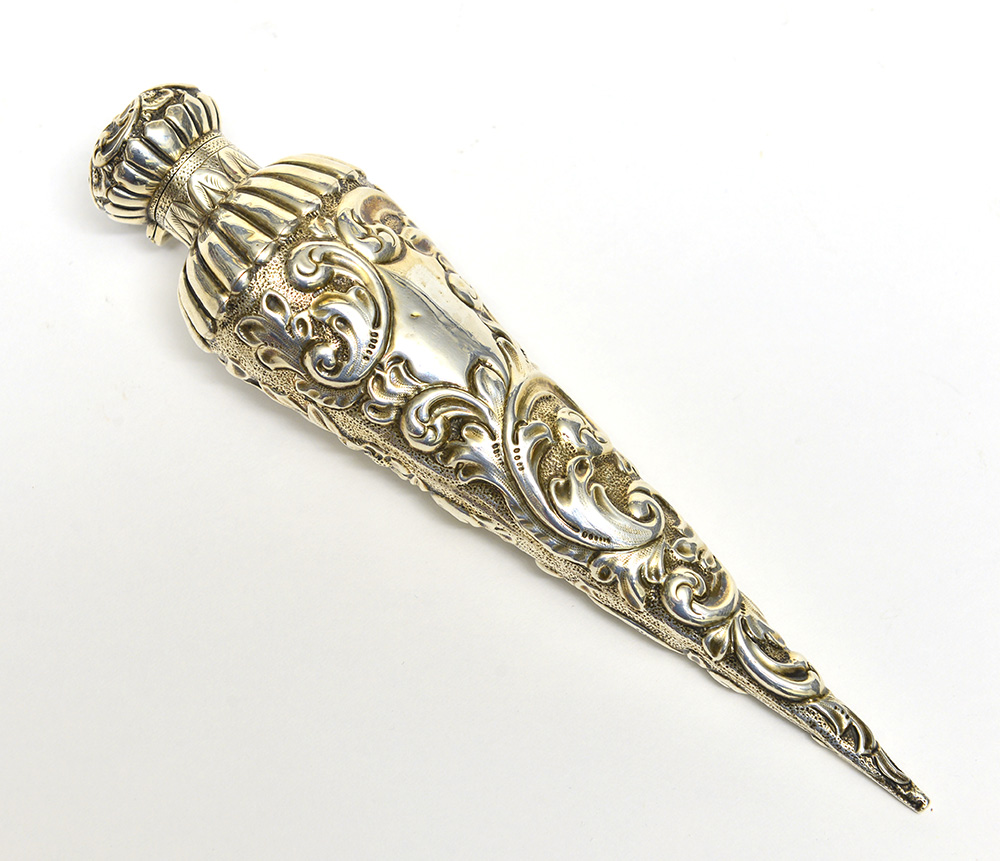 Bottiglia portaprofumo in argento sbalzaro di forma conica, punzoni inglesi, inizio secolo XX