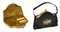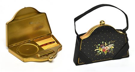 VOLUPTE' Trousse da viaggio con custodia in tessuto nero, la trousse in metallo color oro, rifinitura a smalto nero opaco e pois oro, al centro disegno floreale sempre a smalto e microperle paillettes e tessuto (difetti) VOLUPTE' Trousse da viaggio con custodia in tessuto nero, la trousse in metallo color oro, rifinitura a smalto nero opaco e pois oro, al centro disegno floreale sempre a smalto e microperle paillettes e tessuto (difetti) Goldtone and black enamel carryall with carrying case (defects)
