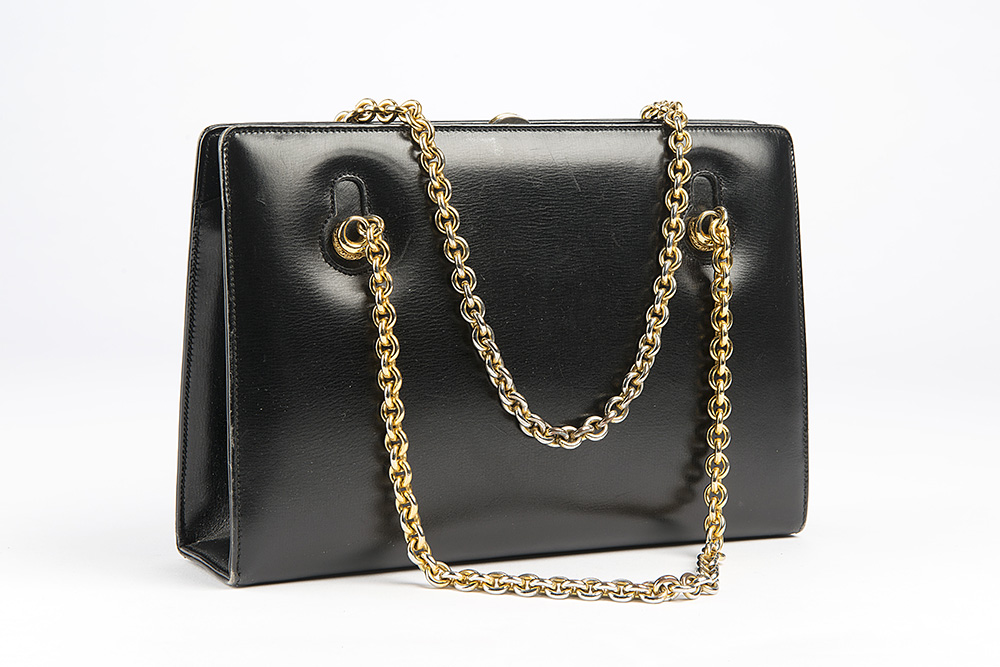 GUCCI Borsa a soffietto in capretto nero con doppia tracolla a catena color oro, 1958. sacchetto originale (cm 24) (lievi segni d'uso)