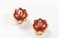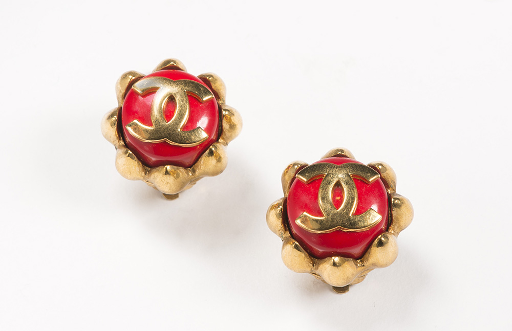 CHANEL Orecchini a clips in metallo color oro e materiale plastico rosso a ricordare un fiore sormontato da logo della Maison in rilievo
