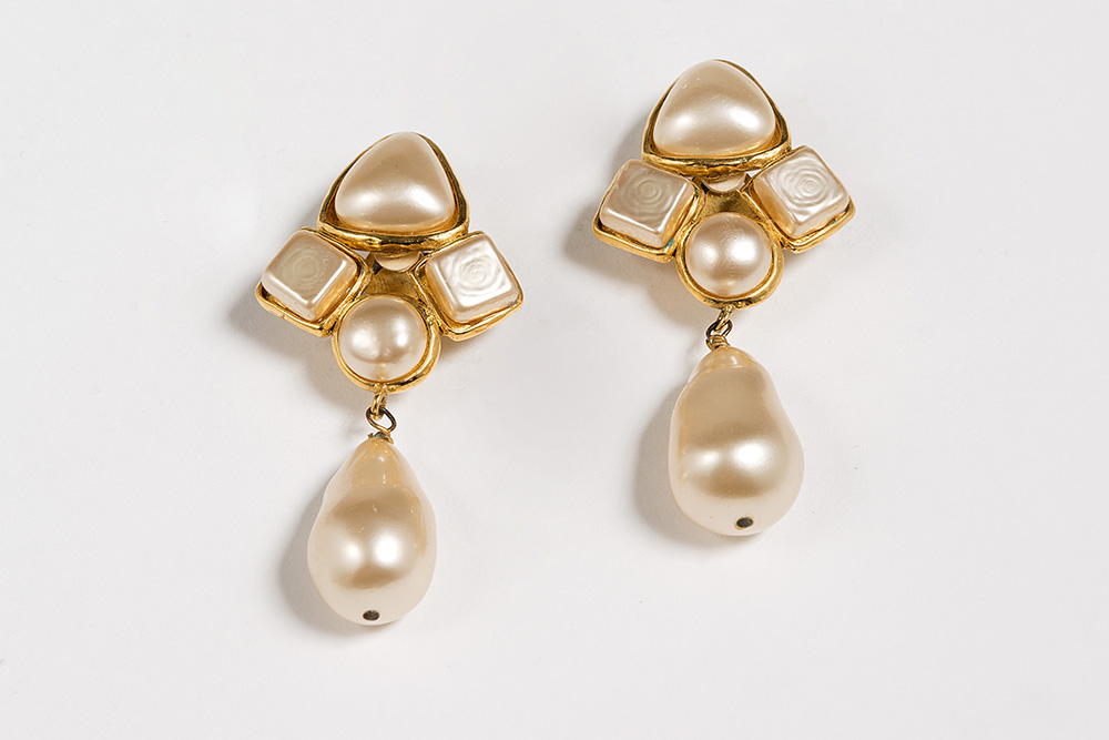 CHANEL Orecchini a clips in metallo color oro con perle fancy di varie forme e goccia fancy pendente (difetti)