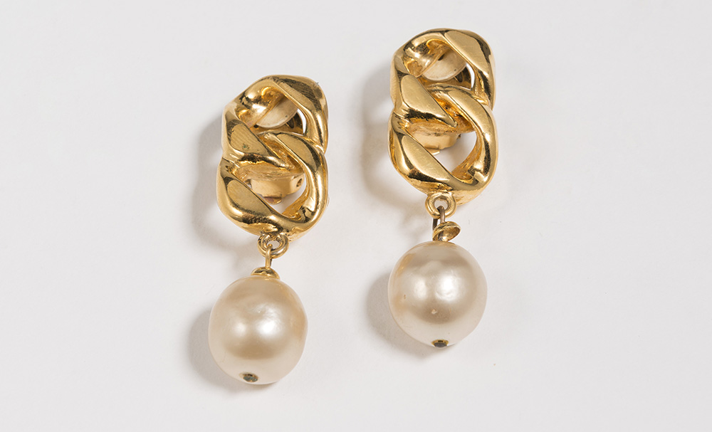 CHANEL Paio di orecchini a clips con motivo di catena in metallo color oro e perle fancy pendenti (lievi difetti)