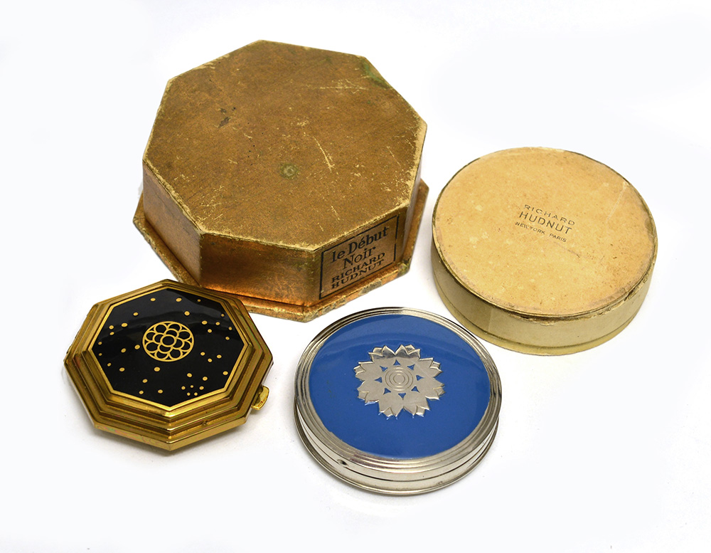 RICHARD HUDNUT Lotto di due vanity cases, uno Le DÈbut Noir ottagonale con smalto nero su metallo color oro e l'altro rotondo con smalto celeste, entrambi in custodia originale RICHARD HUDNUT Lotto di due vanity cases, uno Le DÈbut Noir ottagonale con smalto nero su metallo color oro e l'altro rotondo con smalto celeste, entrambi in custodia originale Lot comprising two compacts of which one Le DÈbut noir, both with original boxes
