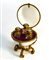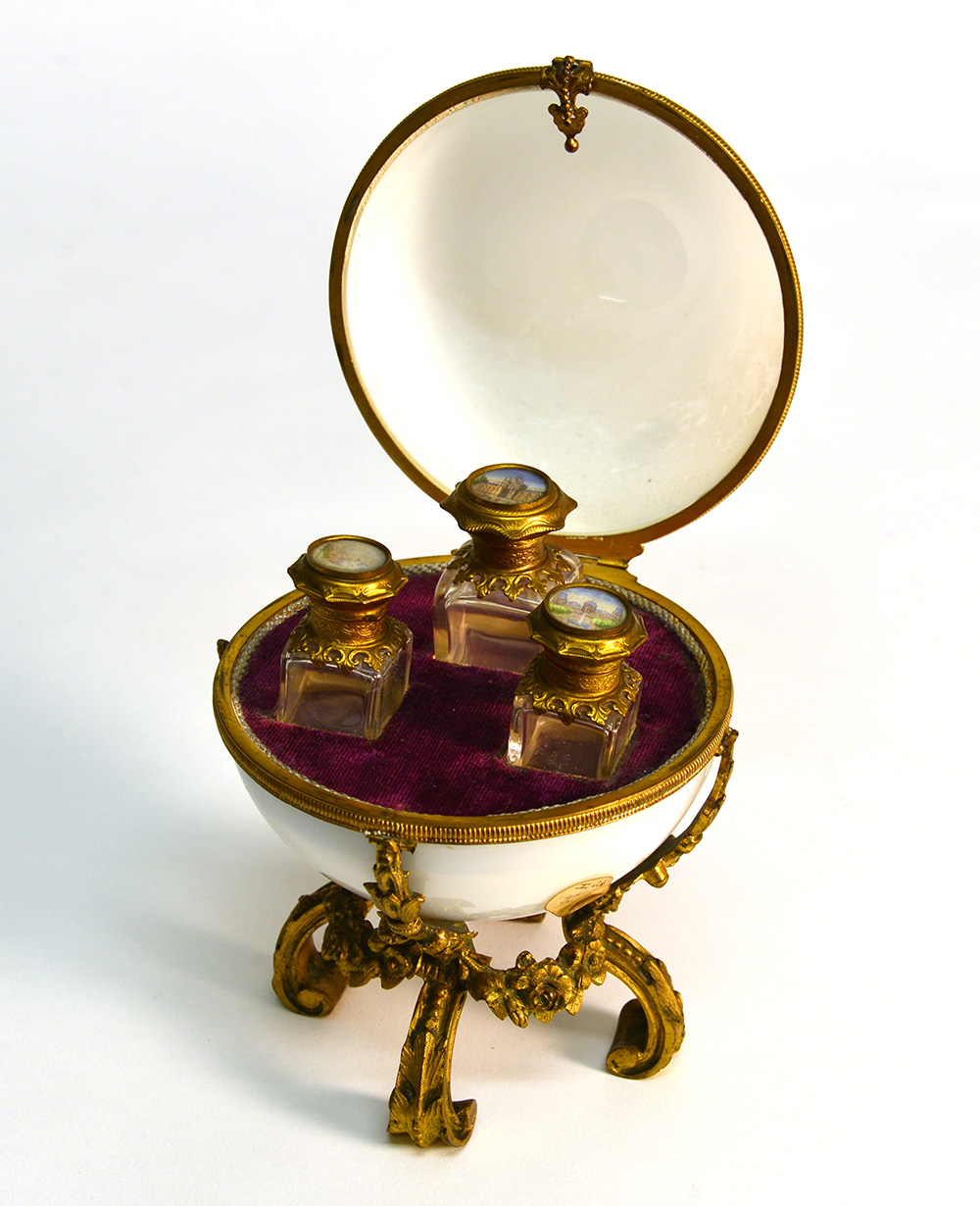 Uovo in vetro opalino bianco con struttura in metallo dorato a contenere tre bottiglie per profumo con miniature sul tappo, Francia secolo XIX