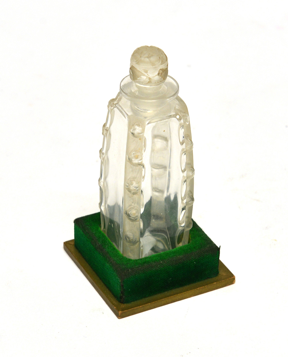 LALIQUE per Roger & Gallet, "Rose et Rouge", bottiglia portaprofumo in vetro incolore decorata negli angoli e nel tappo a rose firma incussa (h. cm. 11) Bibliografia: F. Marcilhac, R. Lalique. Catalogue raisonnÈ de l'oeuvre de verre, Les Èditions de l'Amateur, Paris 2004, p.947.