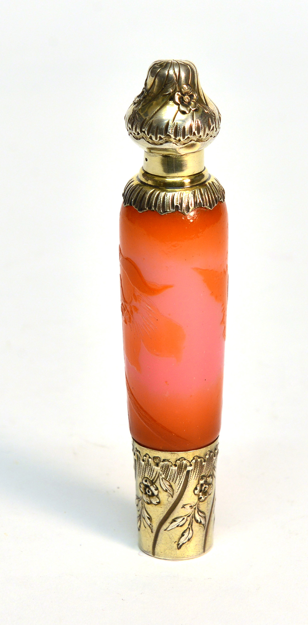 EMILE GALLE' Bottiglia portaprofumo in vetro cammeo decorato nei toni del rosso a fiori. Base tappo e ghiera in argento sbalzato a volute a fiori. Punzoni francesi firma incisa alla base. (h. cm. 15,5)
