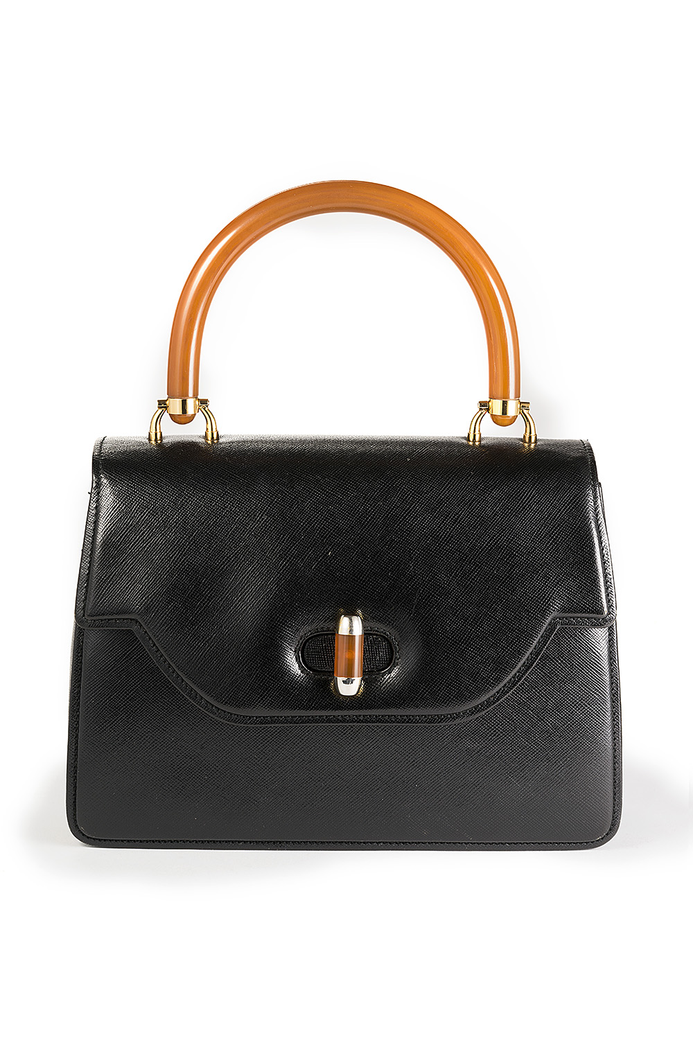 GUCCI Borsa in saffiano nero con manico e chiusura in bachelite, 1961 ca. Sacchetto originale (cm 23.5)