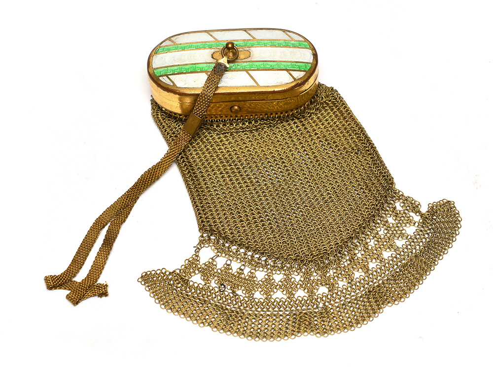 Miniborsetta a rete con frange come il manico, tutto color ottone, mentre la chiusura color oro con specchio nascosto Ë rifinita a smalto guillochÈ bianco e verde Miniborsetta a rete con frange come il manico, tutto color ottone, mentre la chiusura color oro con specchio nascosto Ë rifinita a smalto guillochÈ bianco e verde Mesh bag with guillochÈ enamel top conceiling a compact