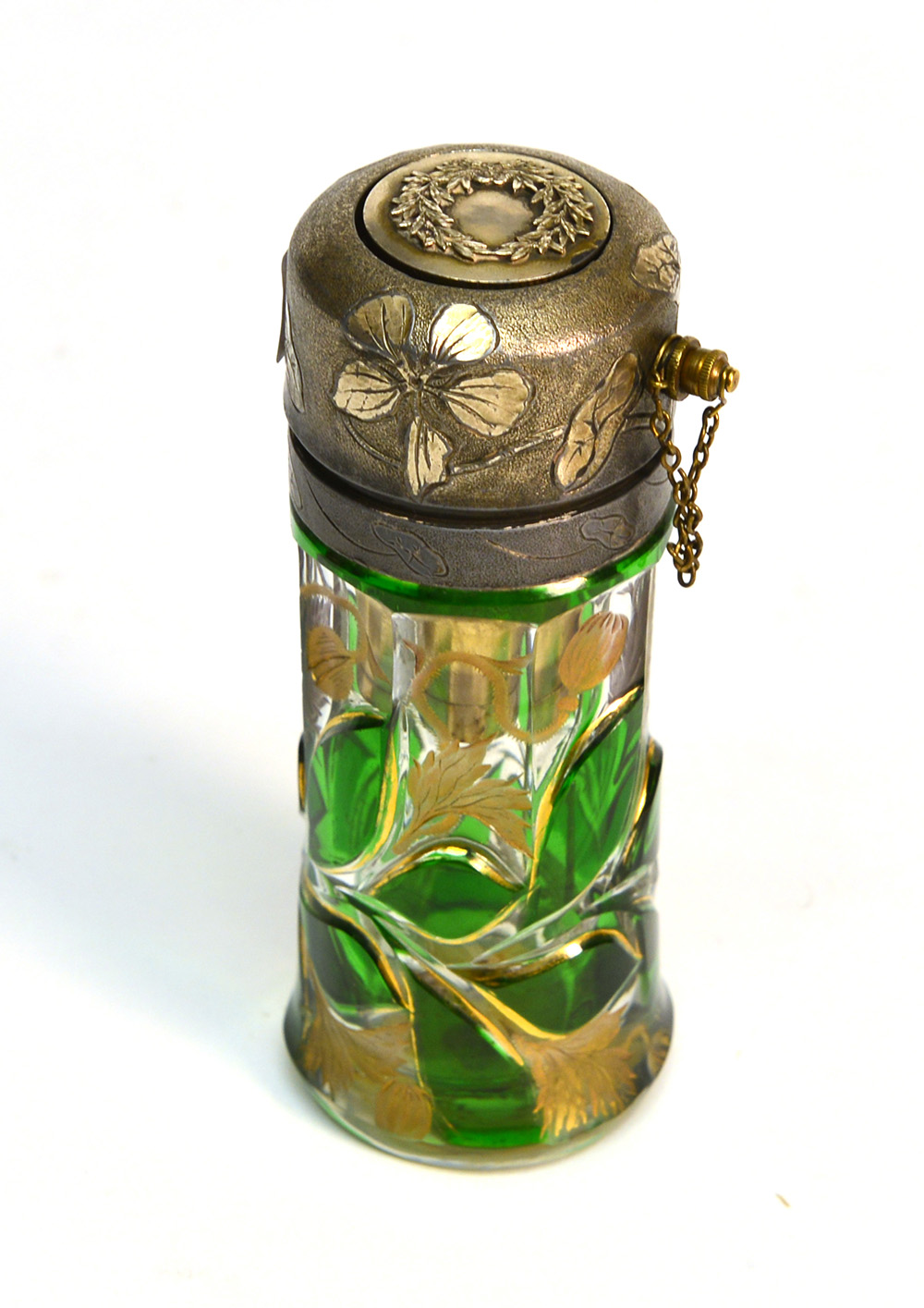 Manifattura inizio sec. XX vaporizzatore in cristallo inciso e decorato in rilievo a fiori e foglie ghiera in metallo argentato incise ninfee e corone d'alloro. Attribuito a Moser( h. cm 12) ( etichetta alla base)