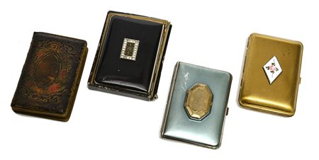MONDAINE ñ Lotto di quattro vanity cases rettangolari in metallo color argento e ottone, una con smalto nero e strass, una metallizzata, una con smalto guillochÈ e l'altra con rifinitura in pelle lavorata a ricordare un libro (lievi difetti) MONDAINE ñ Lotto di quattro vanity cases rettangolari in metallo color argento e ottone, una con smalto nero e strass, una metallizzata, una con smalto guillochÈ e l'altra con rifinitura in pelle lavorata a ricordare un libro (lievi difetti) Lot comprising four compacts (minor defects)