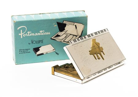 VOLUPTE' ìPortemanteauî, vanity case in metallo nikelato e dorato, lucido e satinato a ricordare e rappresentare un pianoforte in rilievo con carillon, in scatola originale e con certificato di originalit‡ (difetti) VOLUPTE' ìPortemanteauî, vanity case in metallo nikelato e dorato, lucido e satinato a ricordare e rappresentare un pianoforte in rilievo con carillon, in scatola originale e con certificato di originalit‡ (difetti) Carryall with representation of piano-keys, containing music box in original box (defects)