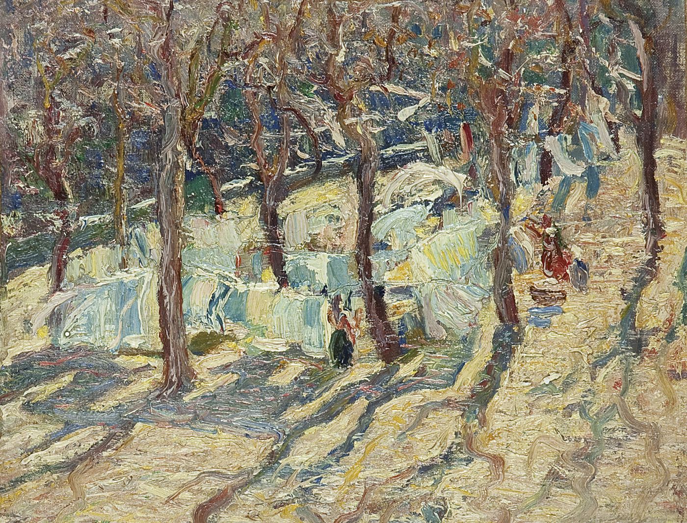 PELUZZI ESO Cairo Montenotte (SV) 1894 - 1985 "Piazzetta (Santuario di Savona)" 1924 22x27,5 olio su cartoncino applicato su masonite Autentica dell'artista al retro rilasciata nel 1978 sull'etichetta dell'atelier con il n. 0581