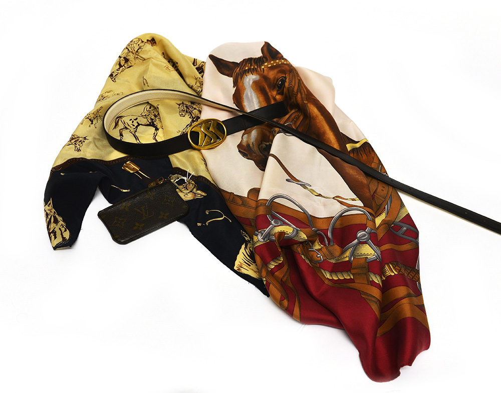 YVES SAINT LAURENT, RALPH LAUREN, SELLERIA, LOUIS VUITTON Lotto composto da una cintura, due foulards di diverse misure uniti ad una bustina portachiavi. (lievi difetti)