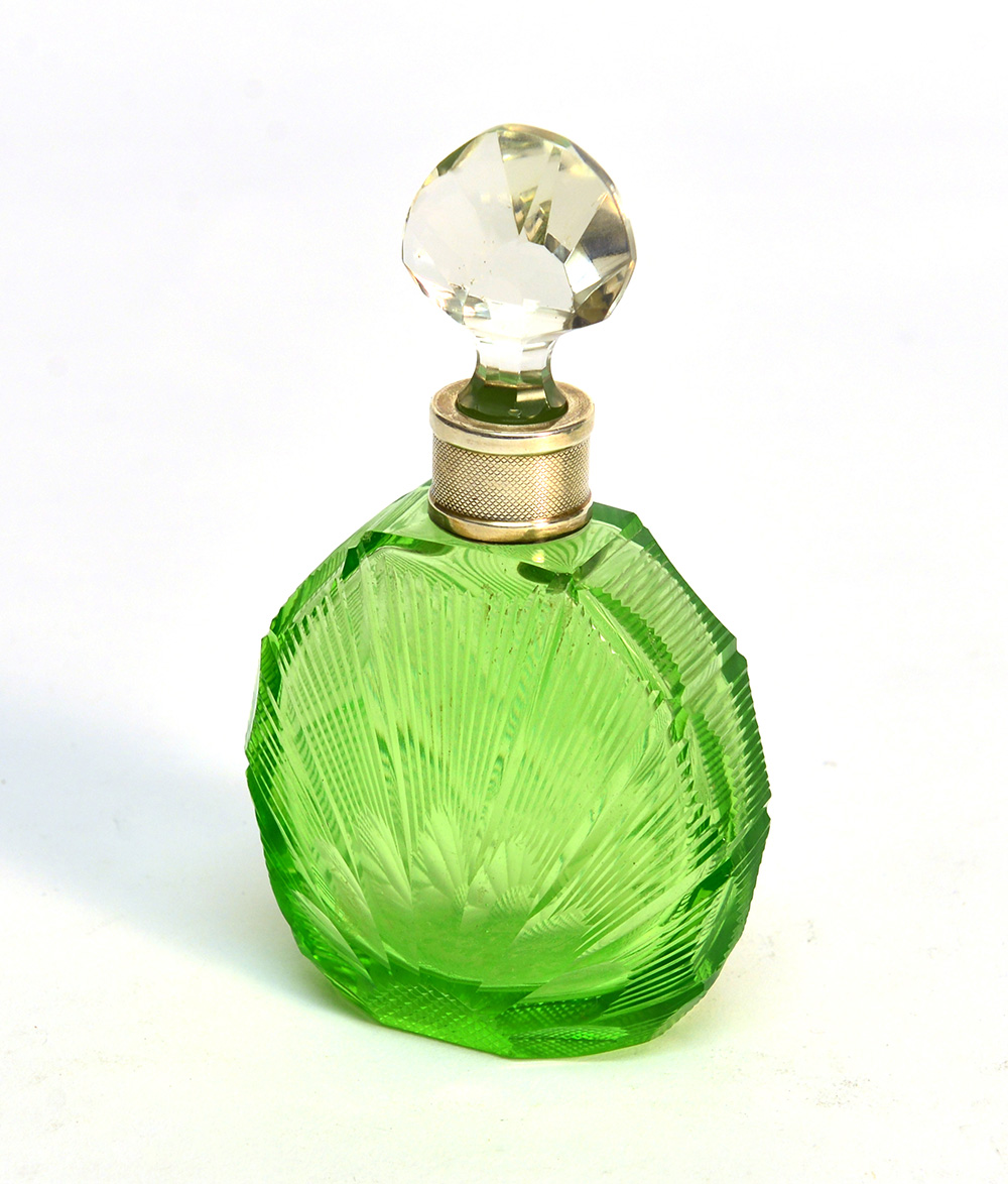 Bottiglia portaprofumo in cristallo a fondo verde decorato conchiglia stilizzata. Ghiere in argento punzoni di Birmingham 1928 argentiere S. B. and S. L. B. ( h. cm. 14)
