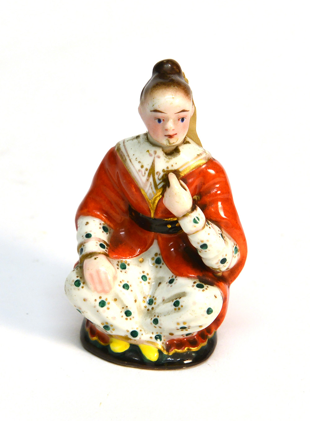 Boccetta in porcellana raffigurante donna assisa (sbeccature sul collo) Secolo XIX