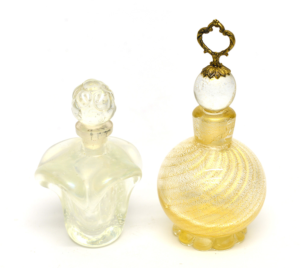 Lotto composto da due bottiglie portaprofumo di fatture diverse decorate con inclusioni di bolle d'aria e foglie d'oro. (h. cm. 18) (lievi difetti)