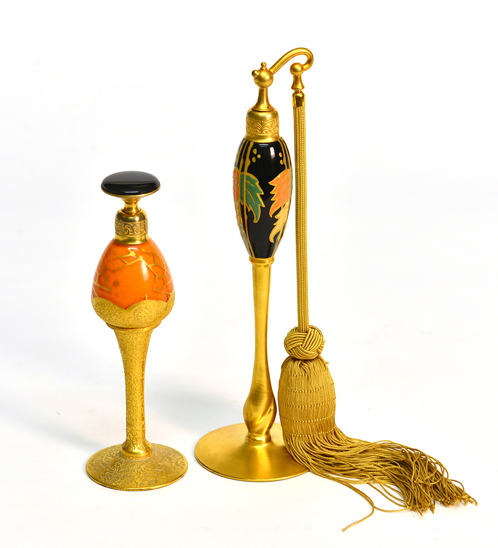 DE VILISS lotto composto da una bottiglia e un vaporizzatore in vetro decorato a motivi stilizzati in doratura e policromia. Firmate alla base ( h. cm. 24) (difetti)