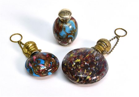 Lotto di tre boccette porta profumo con corpo in vetro, decorate in policromia, ghiere in argento e metallo dorato (difetti)