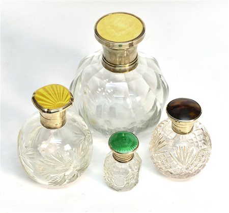 Lotto di quattro bottiglie a boule in cristallo con tappi in argento decorato con smalti guillochÈ e tartaruga Secolo XIX