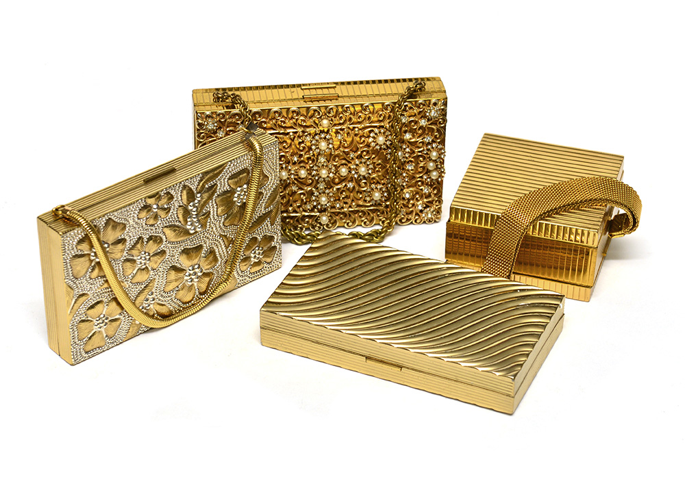 EVANS ñ Lotto di quattro vanity cases, tre con manico, tre di forma rettangolare e uno quadrato in metallo color oro e/o argento, uno rifinita anche con strass e perle fancy bianche (mancanze) EVANS ñ Lotto di quattro vanity cases, tre con manico, tre di forma rettangolare e uno quadrato in metallo color oro e/o argento, uno rifinita anche con strass e perle fancy bianche (mancanze) Lot comprising three compacts some with rhinestones and fancy pearls (losses)